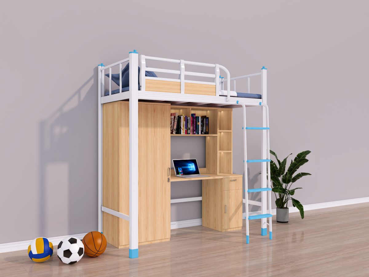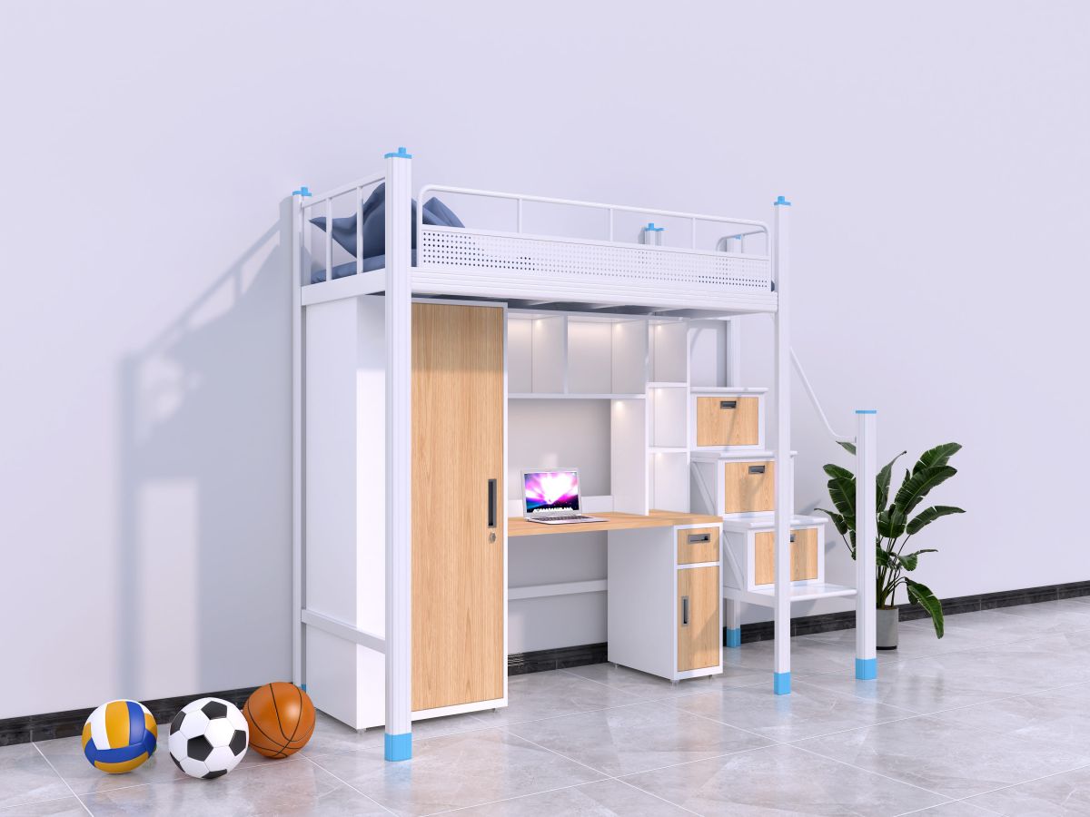 - 床鋪位于上層,下方配置書桌、書柜和衣柜,釋放地面空間,避免宿舍擁擠。